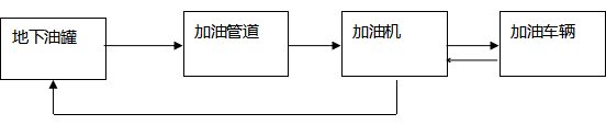 加油工藝:加油作業時,采用潛油泵提供的動力,油品通過加油管道至加油機,進入受油容器。同時,加汽油作業時,有油氣回收回收系統,汽油蒸汽通過油氣回收管道回至汽油罐。具體流程見下圖: