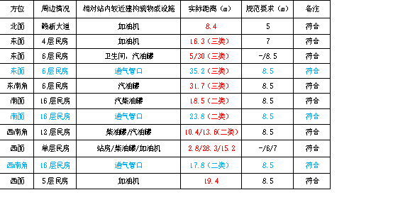 東面:為兩棟居民樓房,其中靠加油區(qū)東側(cè)一棟為4層,距離最近的加油機(jī)16.3m,中間衛(wèi)生間和洗車機(jī)東面為一棟6層樓房,距離衛(wèi)生間為5m,距離相鄰的95#汽油罐30m。
